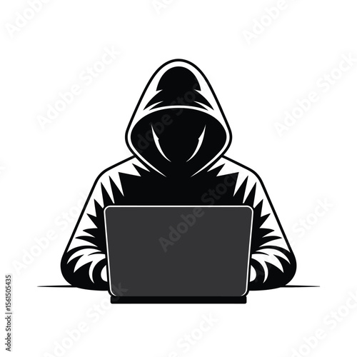 Anonymous hacker in a hoodie working on a laptop computer illustration