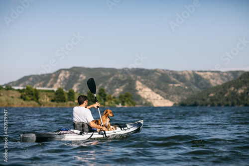 Anonymous man with dog kayaking on lake