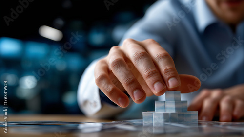 Anonymous person's fingers in sharp focus creating card castle while defocused clothing and surroundings fade away, with copy space