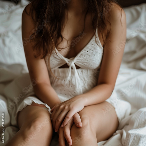 anonymous woman's torso sitting on bed, slumped sad from fertility issues or period pain, clasping hands