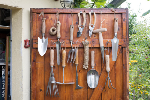 Anordnung Garten hand geräte mit Holzgriffen