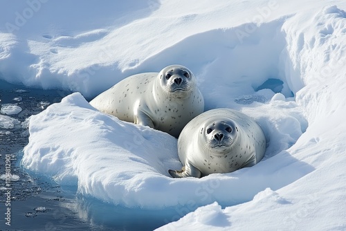 Antarctic Seals on Melting Ice Shelf - Two leopard seals rest on a melting polar ice shelf, symbolizing climate change, wildlife, fragility, adaptation, and survival.