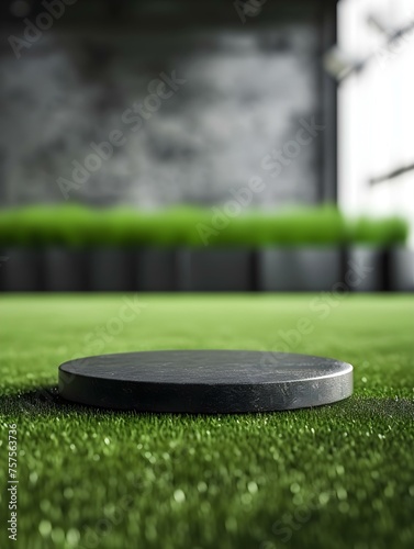 Anthracite round Platform for Product Presentation on a green Pitch. Blurred Sports Background