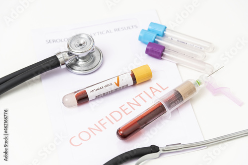 ANTHRAX text is written on a vial whose ampoule is held by a hand in a medical disposable glove. Medical concept.