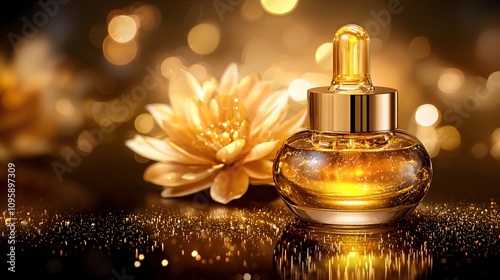 Anti-aging serum oil with golden hues, drops glistening on the bottle, pure ingredients showcased in elegant packaging, floral background