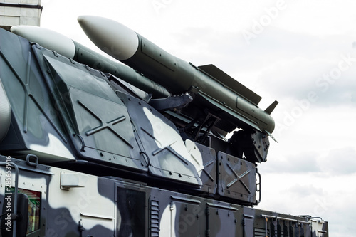 Anti-aircraft missile system. Green army vehicle. Close up view