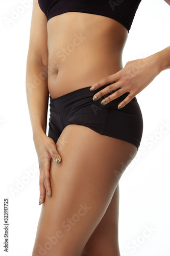 Anti-cellulite and epilation. Slim tanned woman's body on white studio background. African-american model with well-kept shape and skin. Beauty, self-care, weight loss, fitness, slimming concept.