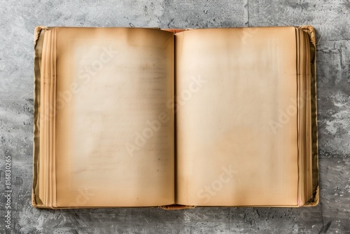 Antiquarian blank book with crisp pages open on a textured wooden surface, ready for creative inscription