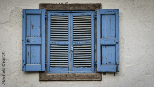Antique blue window featuring three shut panels on a weathered home. Architectural elements showcasing doors and windows. Rustic backdrop with textured details. Pattern, abstract design, travel