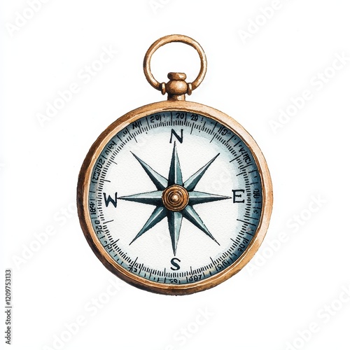 Antique Brass Compass Watercolor Illustration Vintage Navigation Tool Travel Exploration Design