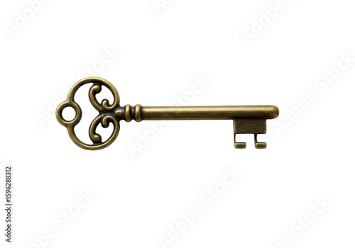 Antique brass key with ornate design, isolated on black background for vintage themes