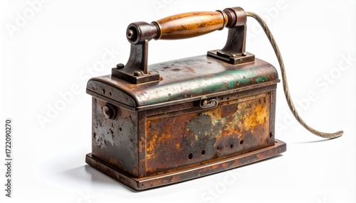 Antique charcoal iron with heavy metal body, wooden handle, jagged top edge, and latch mechanism, showing rust and wear, placed on a neutral surface to highlight historical domestic technology.