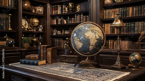Antique Globe and Old Books in a Classic Library Setting for History and Education Themes