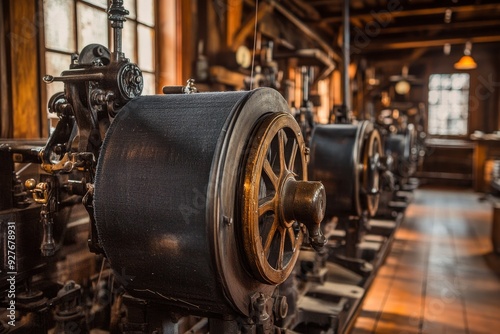 Antique industrial looms with large wheels and belts in wooden workshop environment.