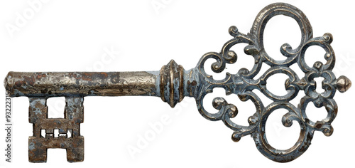 Antique Key to the Past: An intricately crafted, rusty key, whispering tales of forgotten secrets and hidden treasures isolated on transparent background.