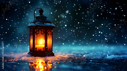 Antique Lantern Illuminates Snowy Winter Night with Warm Glow and Soft Reflections Beautifully.
