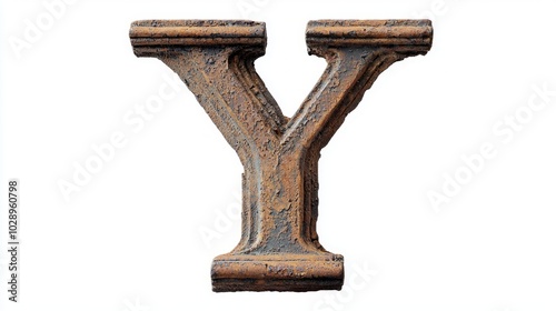 antique letter Y stands out, showcasing exquisite column-like texture that reflects a rich history, set cleanly against a white background, evoking timeless elegance.