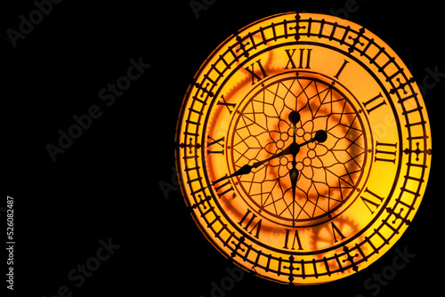 Antique luminous clock with Roman dial. Patterned vintage roman clock on black wall. Blurred image.