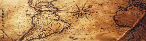 Antique map with artistic flourishes, Vintage, Earthy, Illustration, Emphasizing exploration and history