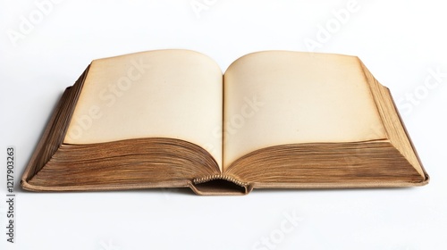 Antique open book with aged yellowed pages on a white surface creating a vintage feel