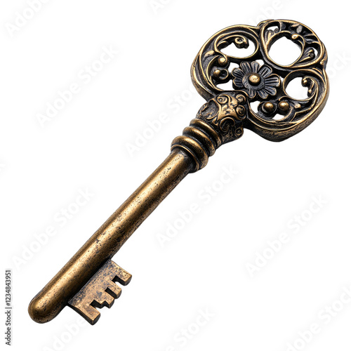 Antique ornate brass key vintage skeleton key detailed macro shot isolated transparent background