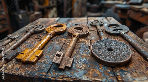 Antique Rusty Keys on Weathered Wooden Surface Vintage Ornate History Metal Object