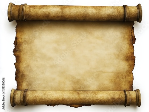 Antique scroll, parchment paper, blank, aged, isolated on white background.