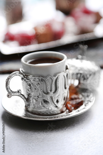 Antique tea-set with Turkish delight on table close-up