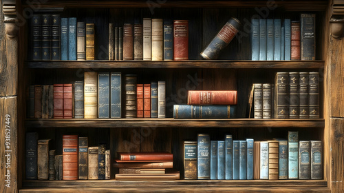 Antique wooden bookshelf filled with aged, leather-bound books.