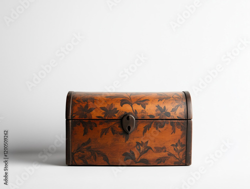 Antique Wooden Chest with Floral Design and Lock on White Background