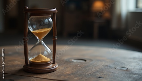 Antique Wooden Hourglass with Flowing Sand on Rustic Wooden Table in Cozy Sunlit Room, Symbolizing the Passage of Time and Nostalgia, Perfect for Concepts of Time Management and Vintage Decor