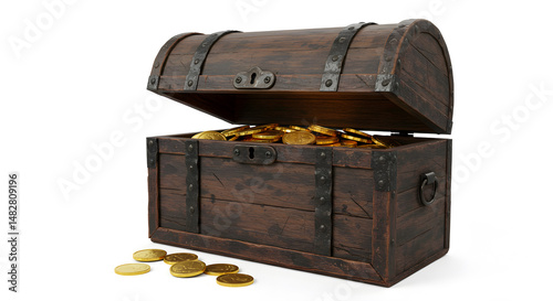 Antique Wooden Treasure Chest Filled With Golden Coins on a White Background