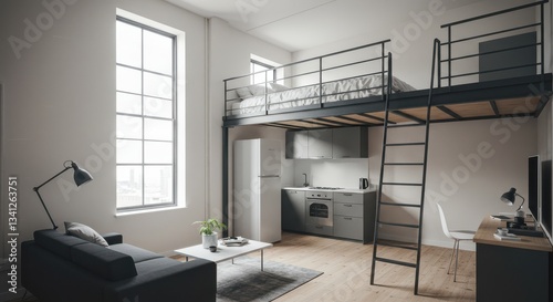 Apartment Interior Design Featuring Loft Bed Above a Functional Kitchen