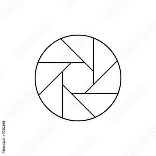 Aperture illustration with six blades forming a circular opening in a simple black and white design style