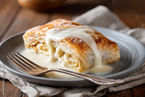 Apfelstrudel Vanillesoße Dessert Blätterteig Süßspeise Apfel Zimt Warm Serviert Hausgemacht Klassisch Österreichisch Nachtisch Winterlich Gemütlich Festlich Genuss Traditionell