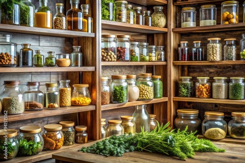 Apothecary-Inspired Shelves: Glass jars and containers reminiscent of a pharmacy, housing organic produce and herbal remedies