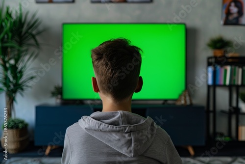 App demo near shoulder of a teen boy in front of an smart-tv with an entirely green screen