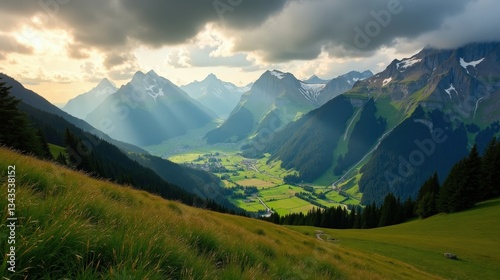 Appenzell region in Switzerland at dawn with cloudy skies, viewed from above. Aerial landscape of mist-covered hills and valleys, bathed in a subtle, diffused morning glow.