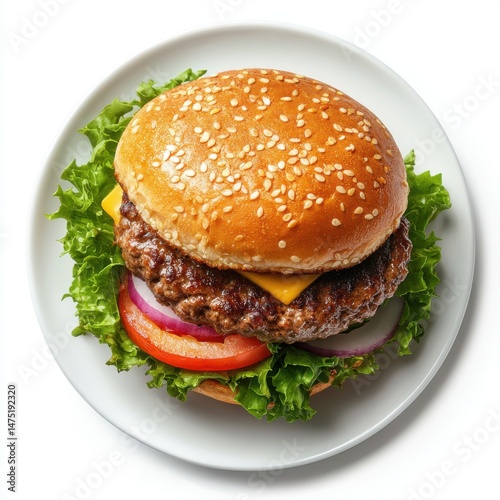 Appetizing Burger Close-Up Shot on White Plate; Fresh Ingredients, Sesame Seed Bun, Studio Lighting, Overhead View