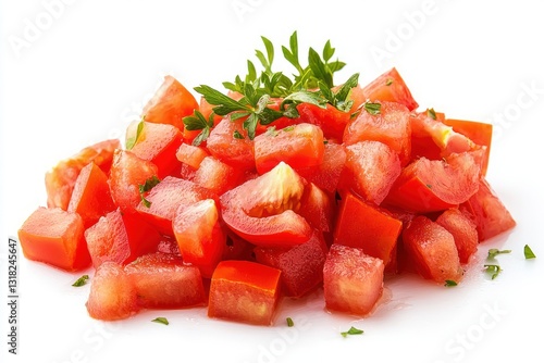 Appetizing diced ripe tomato with fresh parsley leaves set against a clean white background in vibrant close up