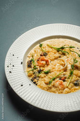 Appetizing risotto with seafood (shrimp and mussel) garnished with microgreens (pea sprouts) in a beautiful white plate.