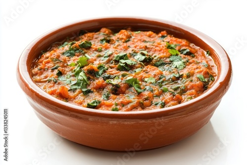 Appetizing traditional moroccan carrot salad with cilantro in terracotta bowl still life
