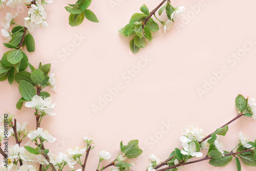 Apple flowers on pink paper background. Pastel colors. Flat lay, top view. Spring flowers with green leaves. Floral pattern. Creative trend composition. Layout with blooming fruit tree. Greeting Card