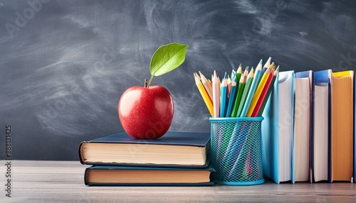 Apple on a stack of books and school supplies in front of a blackboard with space for text; back to school concept, banner greeting