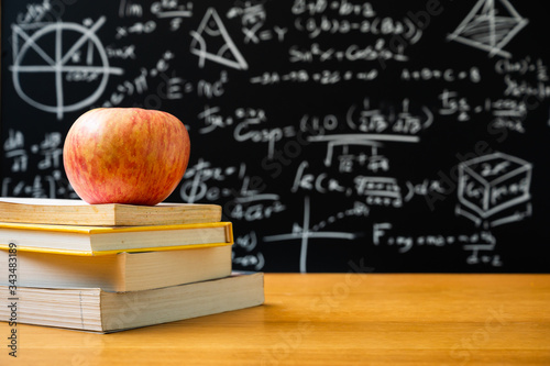 Apple on the stacking of book in front of blackboard with many Mathematical formula. Education background concept.