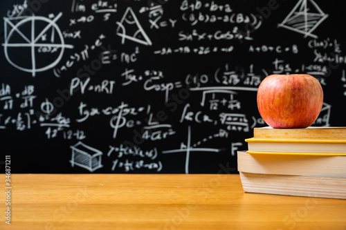 Apple on the stacking of book in front of blackboard with many Mathematical formula. Education background concept.