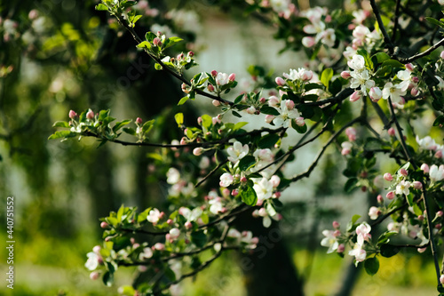 Apple orchard blossoming in garden. Blooming spring flowers, apple tree branch, nature background.