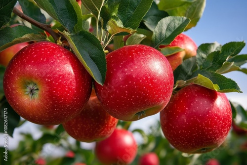 Apple tree laden with bright red apples, set against a clear sky in an orchard