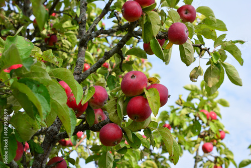 Apples ripening on a tree branch in an orchard under a blue sky