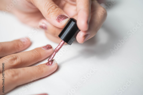 Applying glittery pink nail polish